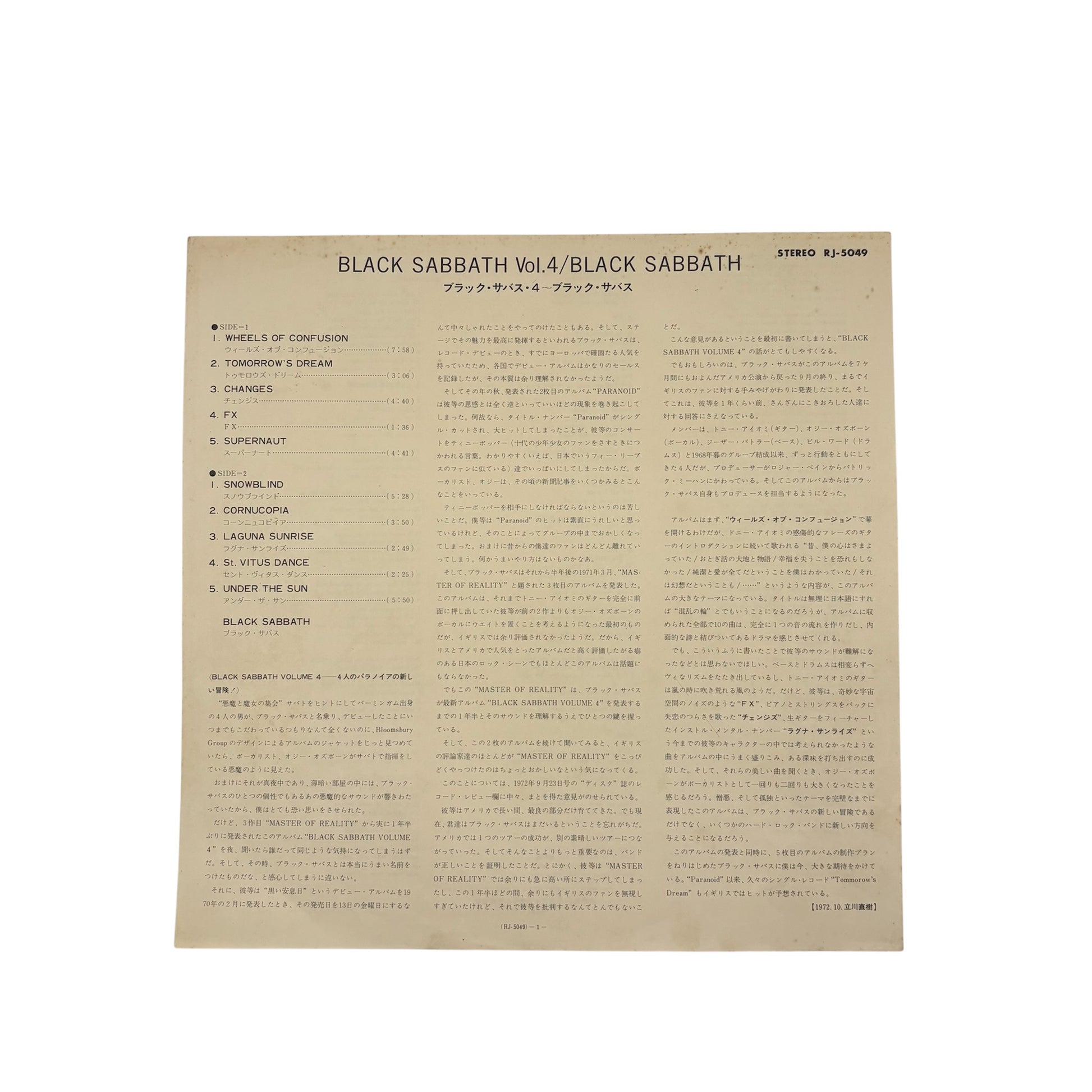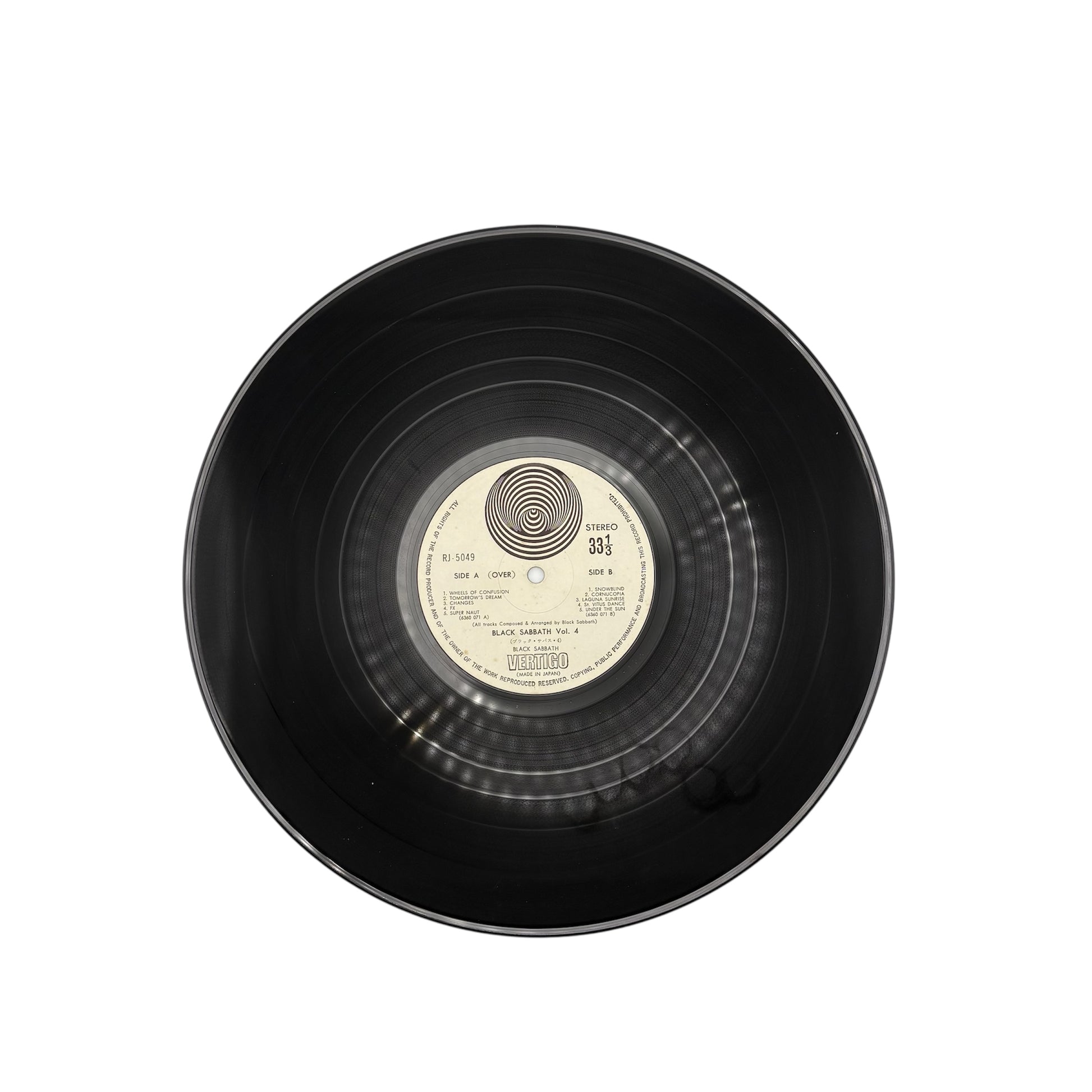 A highly collectible original Japanese pressing of Black Sabbath’s classic fourth studio album Vol. 4, featuring the coveted RJ-5049 Vertigo pressing on black vinyl, accompanied by the lyric insert. This edition is especially prized among collectors due to its rarity and the quality of Japanese vinyl pressings from the early 1970s.